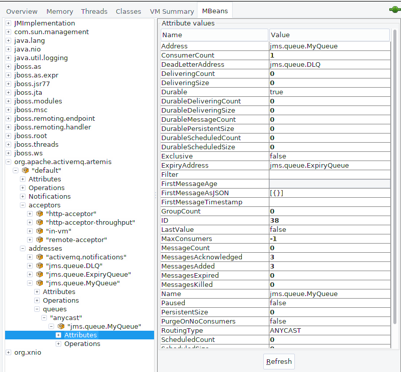 The above has setup the connection factories, queue, and remote connector that the client will connect to. We have also exposed the messaging-activemq mbeans to JMX, so we can inspect via the JConsole.
